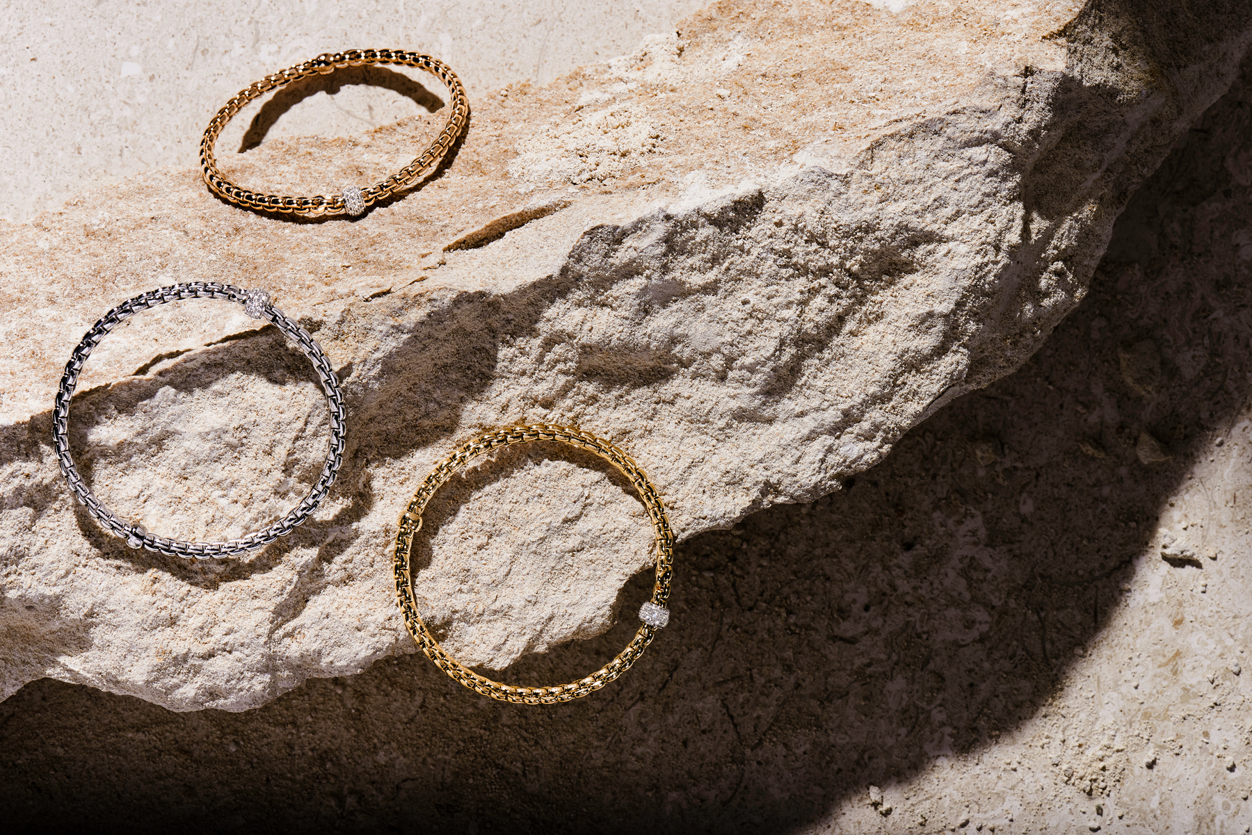 Flex’it è un’invenzione brevettata di FOPE che rivede e attualizza un’idea proprietaria degli anni ’50. Si tratta di un sistema di minuscole molle in oro 18 carati che vengono inserite nella trama della maglia, rendendo i gioielli confortevoli, facili da indossare e regalando nuove forme all’esperienza dei gioielli FOPE.