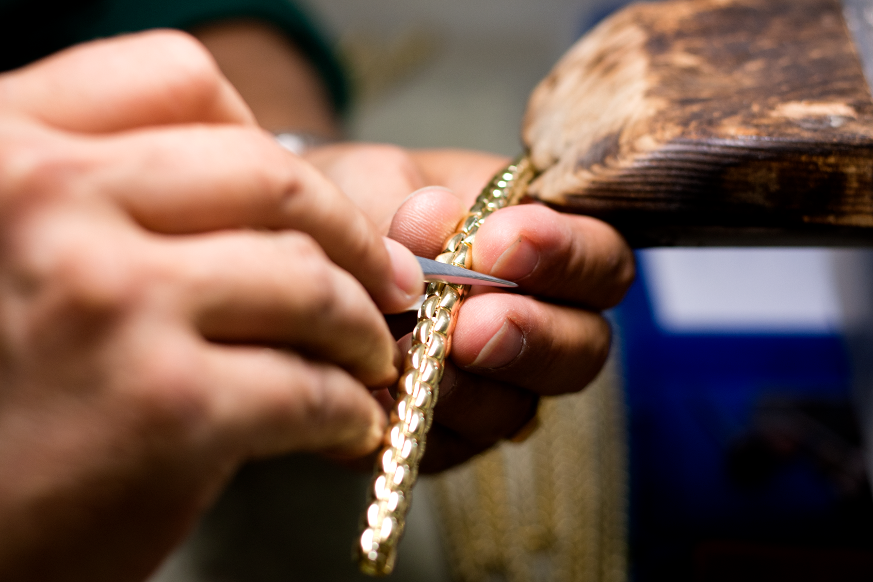 Forte del ricco know-how dei mastri orafi che lavorano nella fabbrica di Vicenza, il team R&S è protagonista della costante evoluzione delle maglie in oro morbide e flessibili. Le attrezzature utilizzate per produrle sono realizzate su disegno esclusivamente per FOPE, grazie a un incontro tra tecnologia e artigianalità unico nel settore.